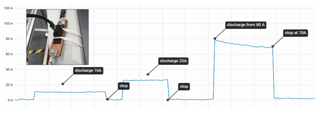 下图10秒的脉冲中,传感器共获得了90个数据点(实例中采样速率受限于采集卡,而不是石墨烯传感器) ▲ 软包电池上进行脉冲充放电峰值的测量