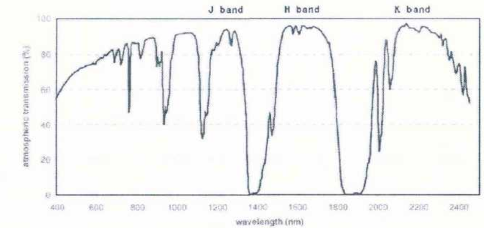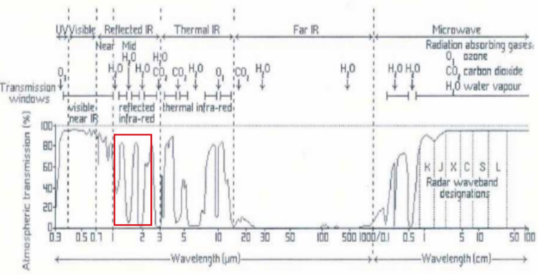 红外辐射吸收较弱,透过率较高的区域,也被称为“大气窗口”。从下图中可以看到,在1.17~2.31um存在J,H,K三个近红外大气窗口,或是在地面大气窗口2.5~5um波段。