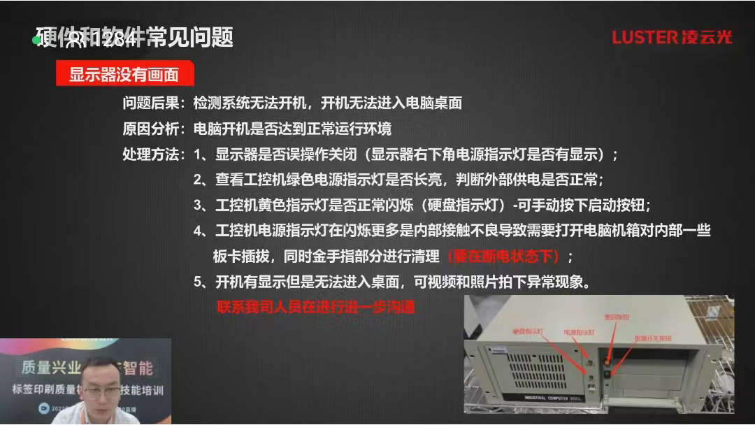 针对标签印刷检测系统的实际操作,高级客服工程师潘金龙进行了一场全面且透彻的讲解。首先是PPT理论知识:讲师系统分享了标签印刷检测设备的硬件构成,并对每个部件的工作原理、工作状态都进行了介绍;然后是检测原理的讲解,让大家对检测的本质有了清晰认知。在此基础上,针对机台的常见故障和和保养方法做了详尽的阐释,让客户在使用中防患于未然。