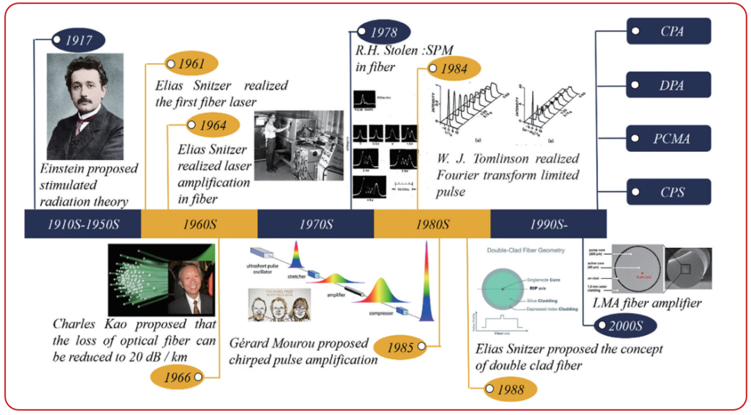 1985年的啁啾脉冲放大技术,1988年的双包层光纤技术,1997年的大模场光纤概念的提出,以及分脉冲放大、预啁啾管理放大、相干脉冲堆积等技术,都对超快光纤激光的发展有着重要的影响。随着超快光纤激光技术的发展,超快光纤激光器已经成为超快激光市场的主力军,在科研、生产、医疗等诸多领域发挥着作用,尤其在精密/微纳加工、高脉冲能量源、微观动力研究、天文科学等方面更有着不可替代的优势。