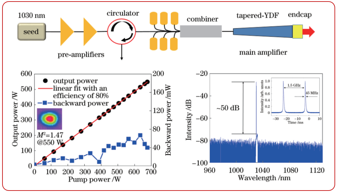2020年报道的550W全光纤单频放大器,就是用输入芯径和包层分别为36.1um和249.3um,输出芯径57.8um和397.3um,增益光纤长度1.3m,锥区长度0.74m的锥形光纤获得。最终光光转换效率80%,线宽45MHz[8]。