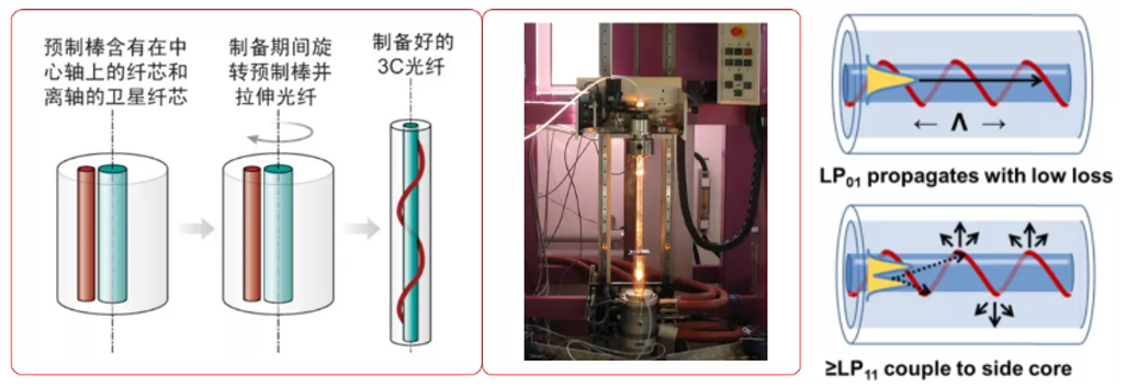 2007年美国Michigan大学超快光学研究中心提出了手性耦合纤芯光纤(3C Chirally-coupled-core),以其能够实现高能量、高峰值功率、单模、保偏的特性逐渐受到人们关注。光纤的石英包层内有两条纤芯,一条是沿轴向分布的中央纤芯,芯径较大,一般在30um以上,用于信号光的传输;另一条是偏离中心轴、围绕中央纤芯螺旋分布的侧芯,芯径比中央纤芯小得多,只有十几微米,主要作用是控制中央纤芯的模式,将高阶模耦合进侧芯并对其产生高损耗(大于100dB/m),使得中央纤芯中的基模可以极低损耗地传输(小于0.1dB/m)。