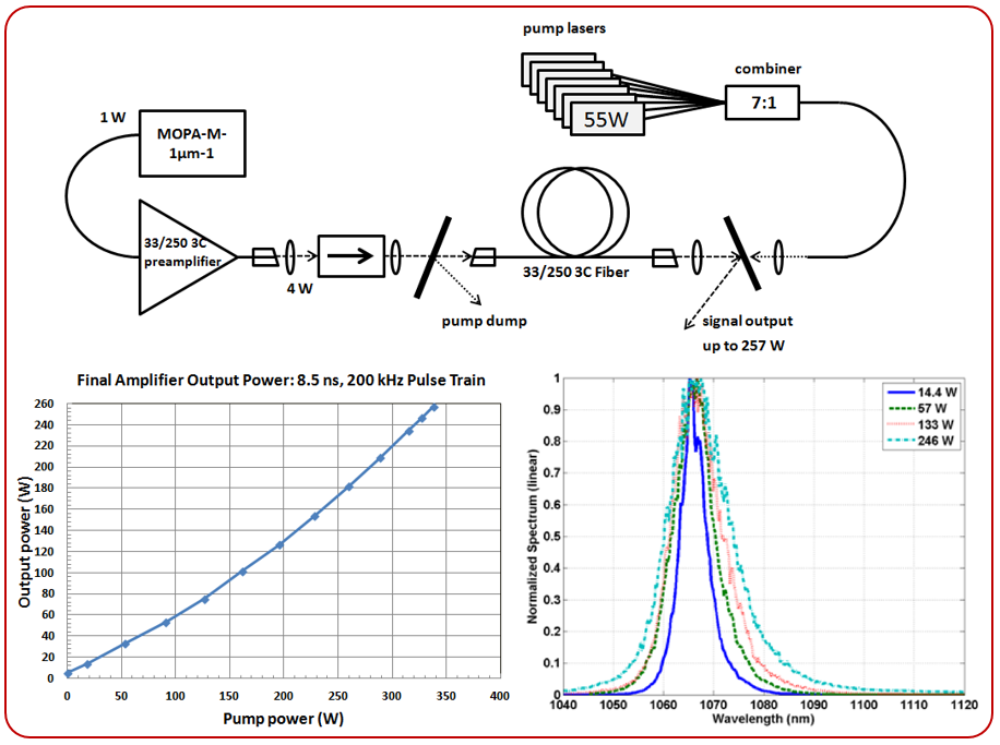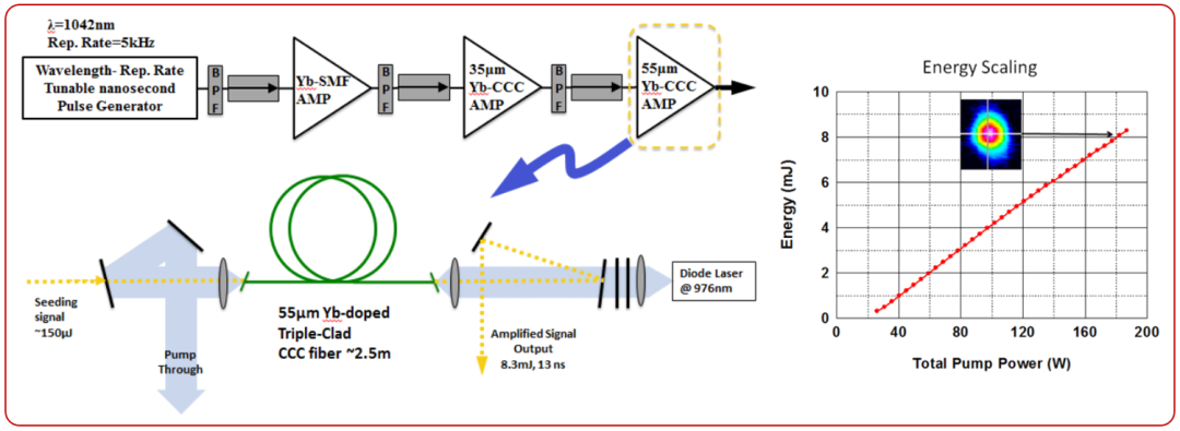 2012年,该研究中心Thomas Sosnowski等人[14]通过33/250um 3C光纤实现了257W,200kHz,8.5ns,1.2mJ脉冲;86.5uJ,575kW峰值功率脉冲,以及利用55um 3C光纤实现了41W,8.3mJ,640kW的高能量脉冲输出。