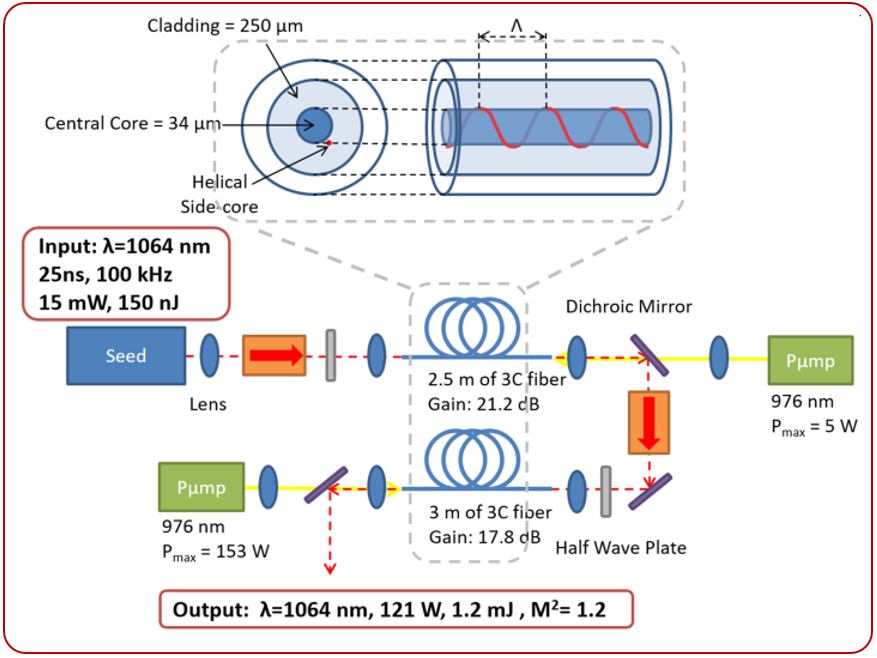 2018年Carnegie Mellon大学的Jinxu Bai等人[15]用15mW,25ns,150nJ,100kHz,1064nm种子源通过两级2.5m和3m的3C光纤放大,获得了121.2W,单脉冲能量12mJ,峰值功率50kW,M2<1.2脉冲输出。