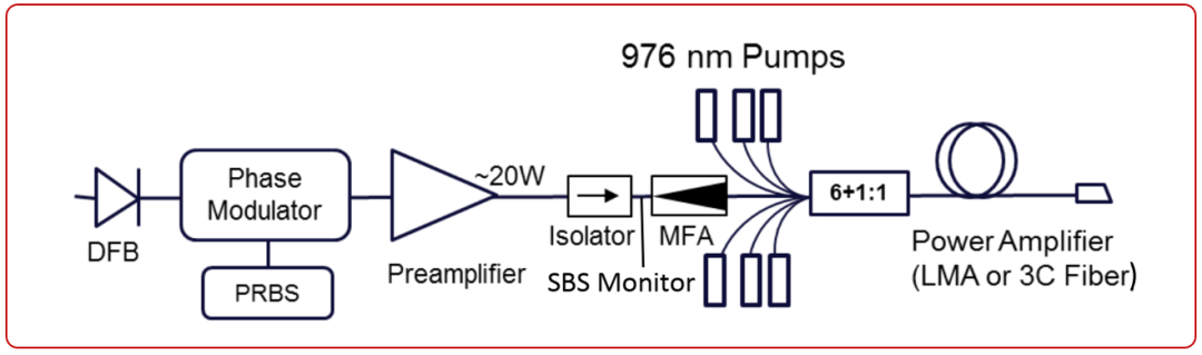 2018年,密歇根大学联合nLight公司,由M. Kanskar和A. Galvanauskas等人分别运用Yb20/400/0.064 DC LMA光纤和Yb 21.9/400/0.059 DC3C光纤对单频线偏振种子源进行功率放大,泵浦源为锁波长976nm模块,分别实现了2.4kW和2.6kW[16]。种子源为1064nmDFB通过相位调制器进行伪随机信号调制适当展宽线宽。MFA实现全光线结构。当种子源20GHz时,实验中Yb20/400LMA光纤在2.2kW时出现了TMI,而3C光纤弯曲直径30cm,在抑制高阶模的同时在2.6kW时没有TMI产生。