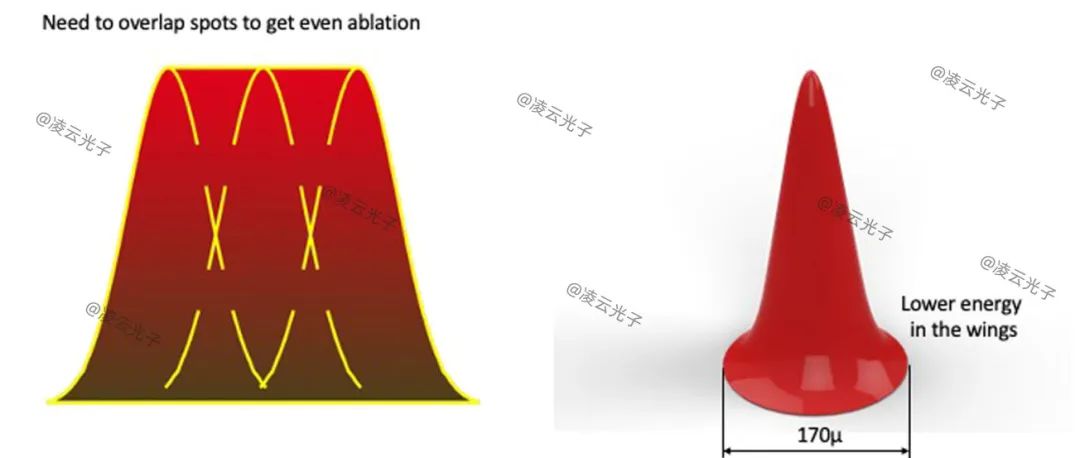 激光能量是通过激光光纤输送的,而不是关节臂。激光束聚焦在170µm大小的微光束光斑上,这些微光束排列成环形,形成由33束微光束组成的“光斑”。光斑具有高斯截面,与其他单模、高光束质量激光器一致。微光束以环形阵列传输,固定光斑重叠35%,在整个环空或光斑上形成均匀的能量分布。微光束重叠,使得高斯光束的波谷叠加地为激光光斑提供非常均匀的能量(图1)。