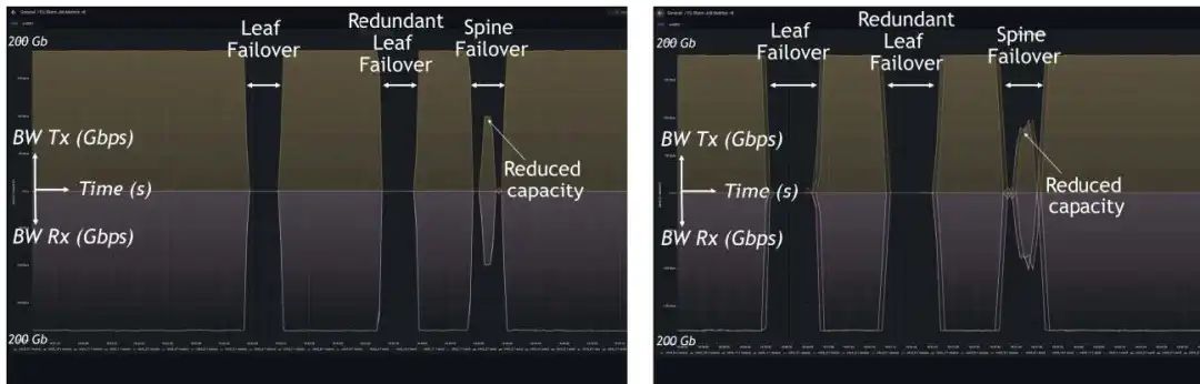 图2显示了我们对UCX和NCCL集体通信库的测试结果。在该测试场景中,进行了IB交换机故障模拟。图表显示了实验中涉及的一个DGX的IB界面上的带宽(y轴)随时间(x轴)的变化,对于all-to-all和all-reduce的微基准测试。基准测试在4个DGX之间和接口之间产生相同的流量。我们运行微基准测试,模拟故障,并监控随着时间的推移应用程序的性能和状态。在Spine故障期间,由于活动链路的减少,系统的容量会降低,但应用程序有可替代路径可用,不会崩溃。启用弹性方案后,可以在几秒钟内恢复群集的全部性能(Spine故障切换)。在Leaf层发生故障(Leaf failover)的情况下,应用程序崩溃,受影响的IB接口将保持离线状态,直到问题解决。启用弹性方案后,应用程序在中断几秒钟(目前约为7秒,但有待优化)仍能继续运行,系统的全部容量也能够恢复。