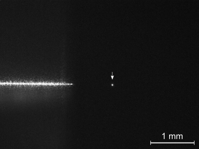 图为真空中用Koheras BOOSTIK C15发出的激光束捕获的悬浮纳米球(白色箭头位置)。压力低于1×10-6 mbar。