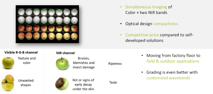 如何突破这一技术瓶颈?答案在JAI多光谱相机,凭借棱镜技术,通过双波段检测,保障产线高速检测外表损伤的同时检出水果内部腐坏等情况。