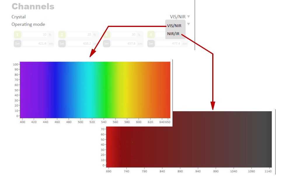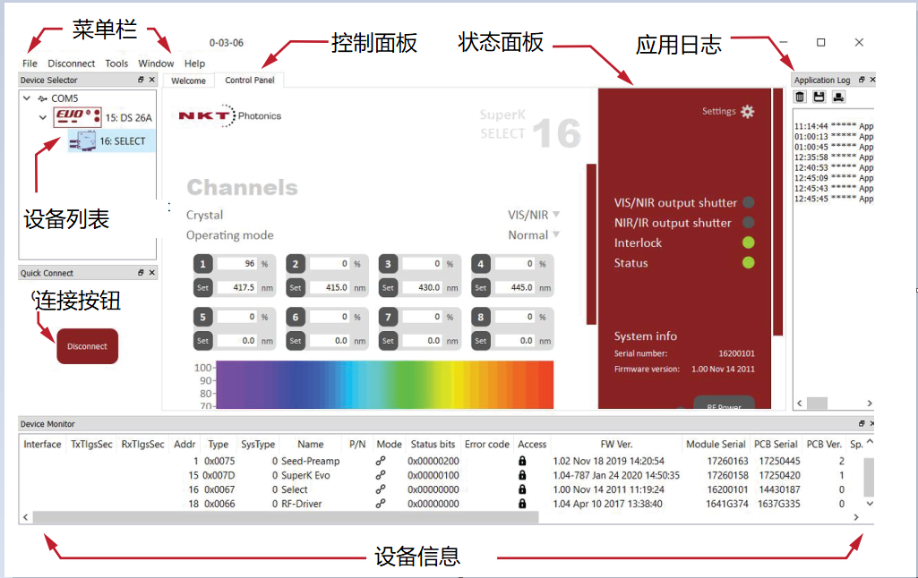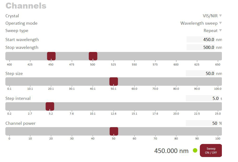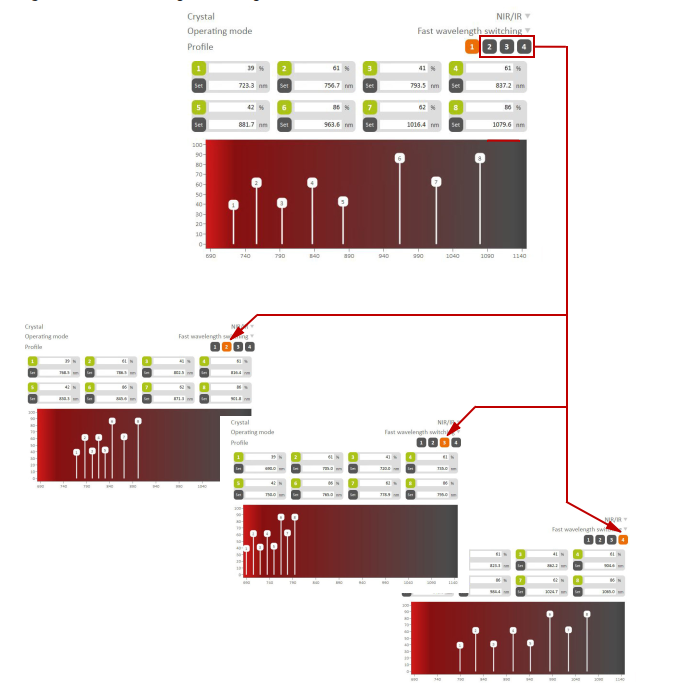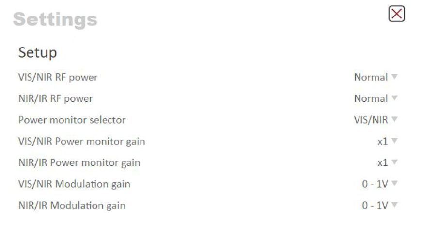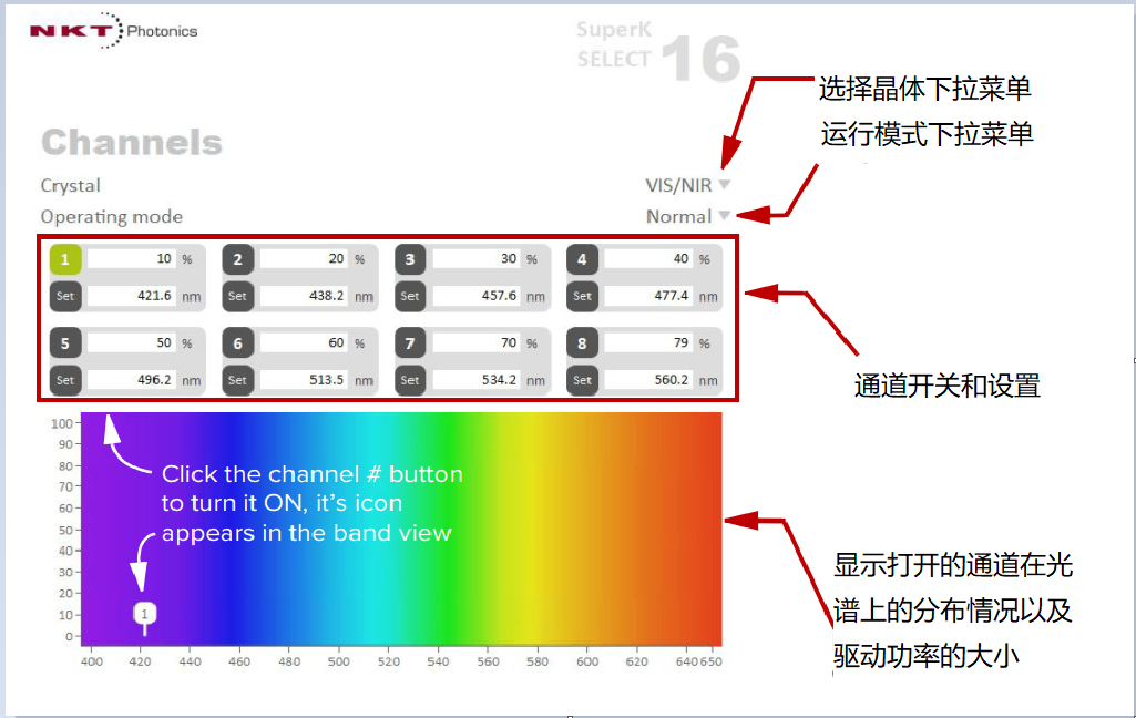 值得注意的是,在软件设置选项中输出晶体的RF功率模式都要选择Normal模式,图11所示,这个模式已经在NKT工厂进行了上述射频功率曲线矫正优化,除非要交换某些硬件,否则不需要进一步优化。只有当一个新的AOTF晶体或新的外部RF驱动器被添加到SELECT时,才使用Overdrive模式。在这些情况下,在工厂设置的最佳射频功率校准曲线不再有效,可能需要进行新的校准。