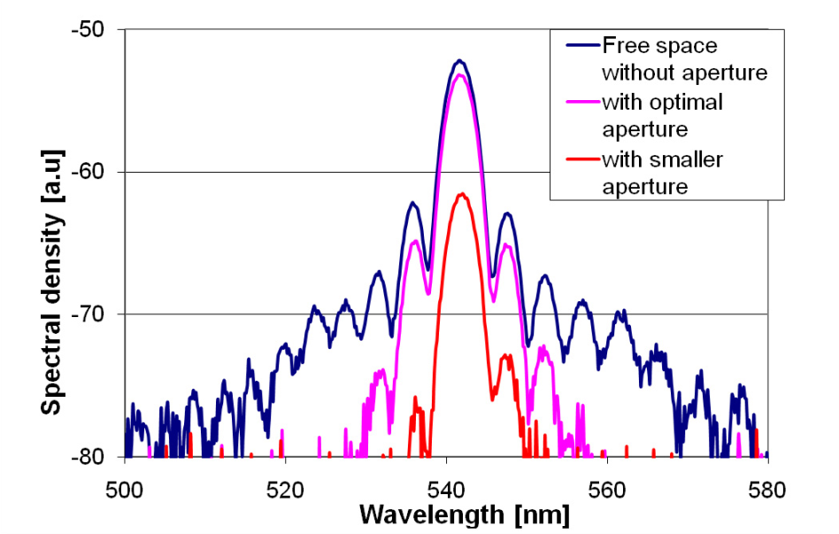空间光输出时:为了优化输出光束的质量,通过一个小孔径光阑对其进行滤波。图9显示了单个AOTF通道的光谱输出与孔径大小的函数关系。无孔时,主峰两侧各有多个侧叶。减小孔径的大小会降低旁瓣的功率。功率先在外瓣下降,然后在内瓣下降,最后在主瓣下降。