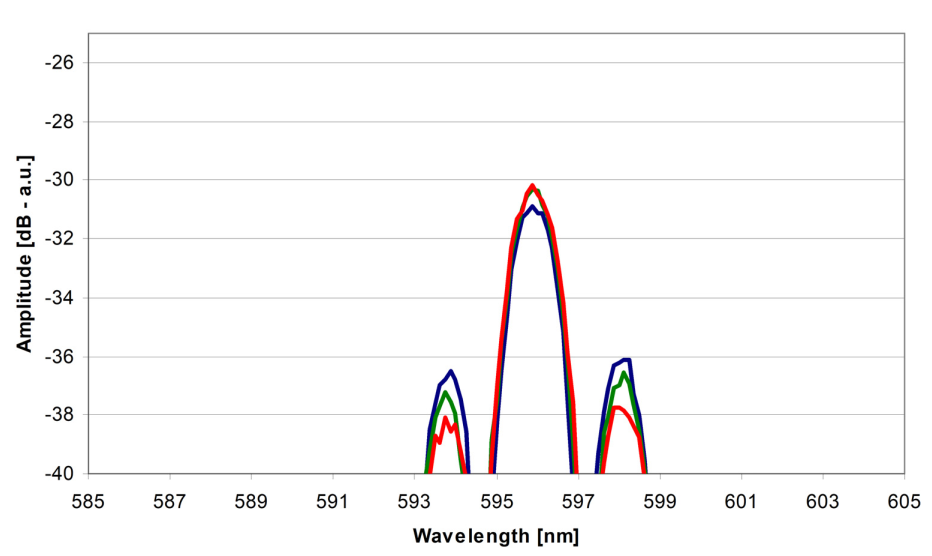 在图10中,红色曲线是最优的,而绿色和蓝色曲线是当射频功率水平超过最优时的结果。旁带功率增大,中心峰幅值反而减小。总之,边带和中心峰值之间的功率比由所选配置和运行参数决定。例如,所选择的波长,射频功率和所使用的射频电缆长度。