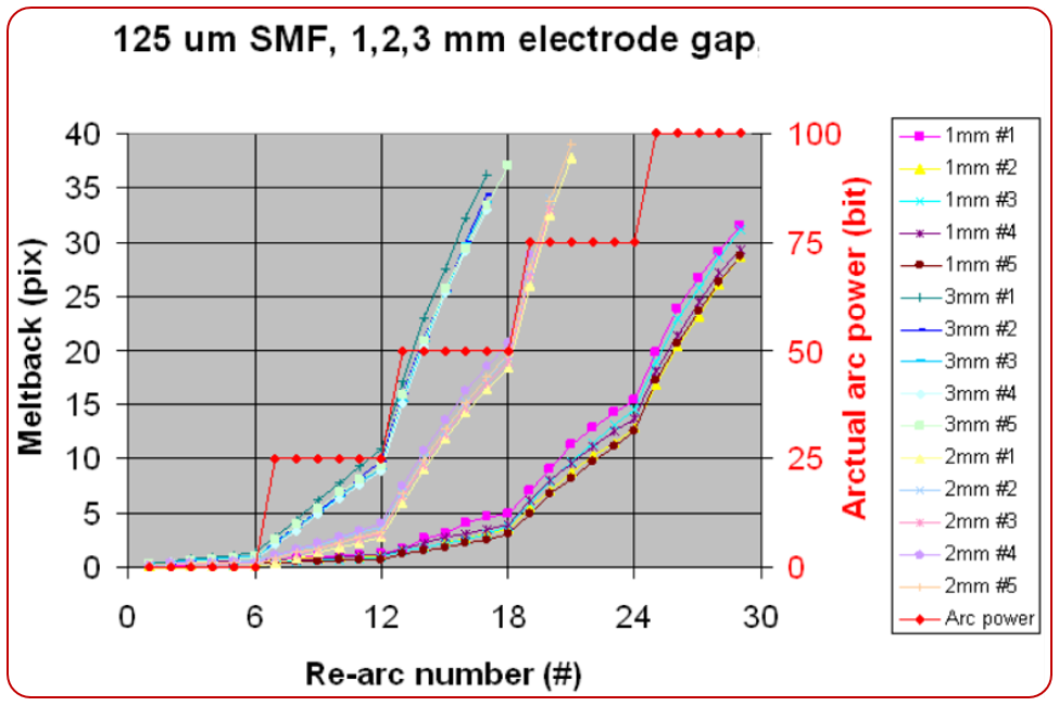 4.测量光纤棱角回熔距离(Gap2-Gap1) 5.增加放电功率并重复步骤4和5 6.根据棱角回熔斜率计算所需放电功率