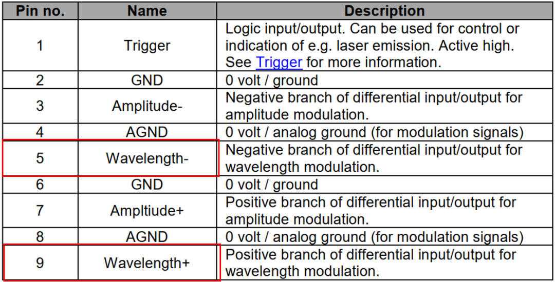 从表中可以看到5针对应的是波长往短波方向移动,9针对应的是波长往长波方向移动。2,4,6,8针都为地,其中的任意一个接地就可以,不用全都使用。1,3,7针脚的功能是激光器选配功能,不是所有机型都有。