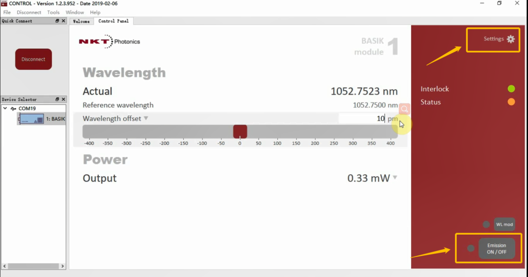 在Control Panel界面下,可调整波长、功率(部分型号需选配),点击Emission on可输出激光,点击WL mod开启PZT波长调制功能。
