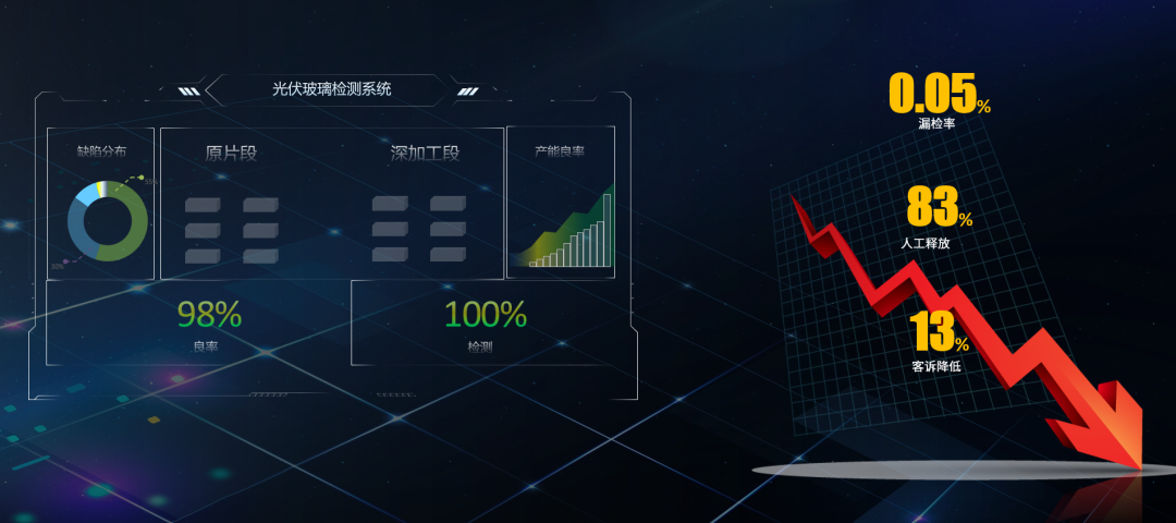 “双碳”风潮下,光伏赛道火热,光伏玻璃行业竞争日趋激烈。据统计,2022年新点火窑炉32座,新点火及复产的产能占全年总产能的46.85%,同时光伏玻璃售价逼近成本,质效升级变得至关重要。在提质增效的巨大压力下,光伏玻璃龙头企业(以下简称A公司)选择与凌云光合作,共建智能工厂,成功实现产能升级,释放83%目检工人工作量。目前已稳定运行1年有余,无相关质量投诉发生。