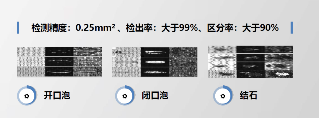 针对闭口泡、开口泡、结石缺陷,漏检率0.03%,检出率超过人工25倍