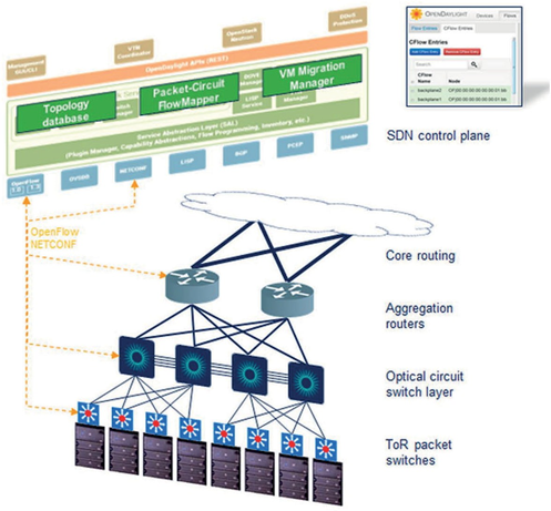 通过SDN控制器中的 Packet-Circuit FlowMapper 使用从监控网络端点之间的流计算得出的数据分析来识别持久的东西向数据流。一旦被识别,控制器就可以使用 RESTCONF和 NETCONF 动态地重新配置网络,为通过光路交换层的这些大数据流创建低延迟光路。通过 L2/L3 分组交换路由器将这些大流量卸载到光路交换层缓解拥塞并减少延迟,从而显著提高网络基础设施的效率和吞吐量。
