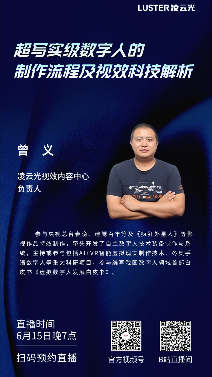 6月15日晚7点,由凌云光重明视效工作室负责人曾义带来直播分享,将围绕《超写实级数字人的制作流程及视效科技解析》,从超写实级数字人内容创作需求及难点、制作流程、视效科技和影视级应用案例等方面进行分享。