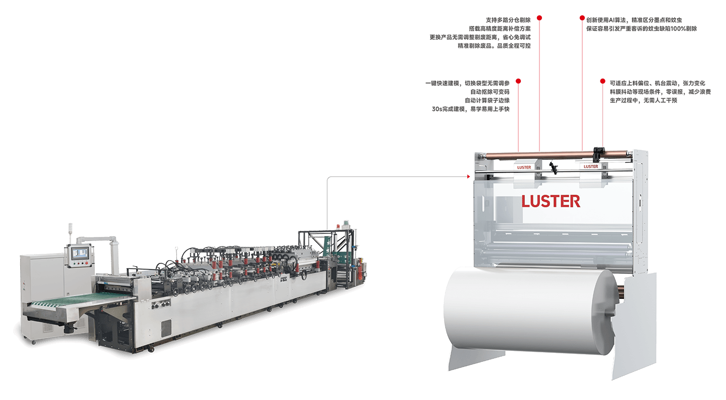PackHERO-B制袋机在线检测系统是凌云光基于最新AI算法打造的整体解决方案,专为食品、日化等软包装印刷行业的制袋检测与剔除(理袋)需求设计,适用于所有制袋机型。兼容模切、单刀断袋、两刀断袋的裁切方式,适用于铝塑复合、纸塑复合、塑塑复合、多层复合等结构的非镭射材料的检测。系统可以对检测到的缺陷进行分级处理,并可针对特定等级缺陷发送剔废信号。该信号兼容理袋机或独立剔除装置进行废品剔除,同时支持在线贴标、切刀停切(避免切到缺陷位置)等处理方式。