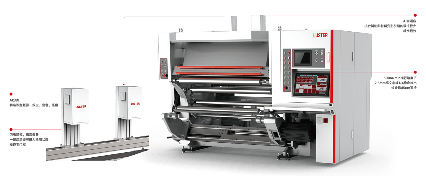 PackHERO-P软包在线质量检测系统是针对宽幅卷料产品研发的高精度、自动化的检测系统,能及时发现缺陷,可检测墨点、白点、刀线、偏色、蚊虫、异物、版伤、脏污等缺陷,减少材料浪费,降低生产成本。方案还可用于复合机、涂布机、正反面检测。