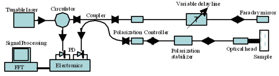 扫频光源的特点是在整个扫频周期表现为一定光谱宽度的光,在每个瞬时时刻发出的光为准单色光,在扫频正程阶段,波长由短到长随时间进行扫描。也就是说,它是一种可调谐光源,每次发射一个波长,在很宽的光谱范围内快速的进行扫描。SS-OCT在光源处就实现了光谱的空间解析,所以探测装置就可利用单点平衡探测器按时间顺序接收干涉信号。
